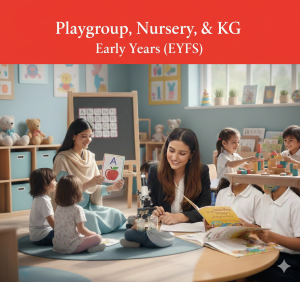 We follow the UK’s EYFS framework, focusing on the seven key areas of development. From the first steps in Playgroup to KG graduation, we nurture social skills, communication, and physical growth in a safe, play-based environment that sparks a lifelong love for learning